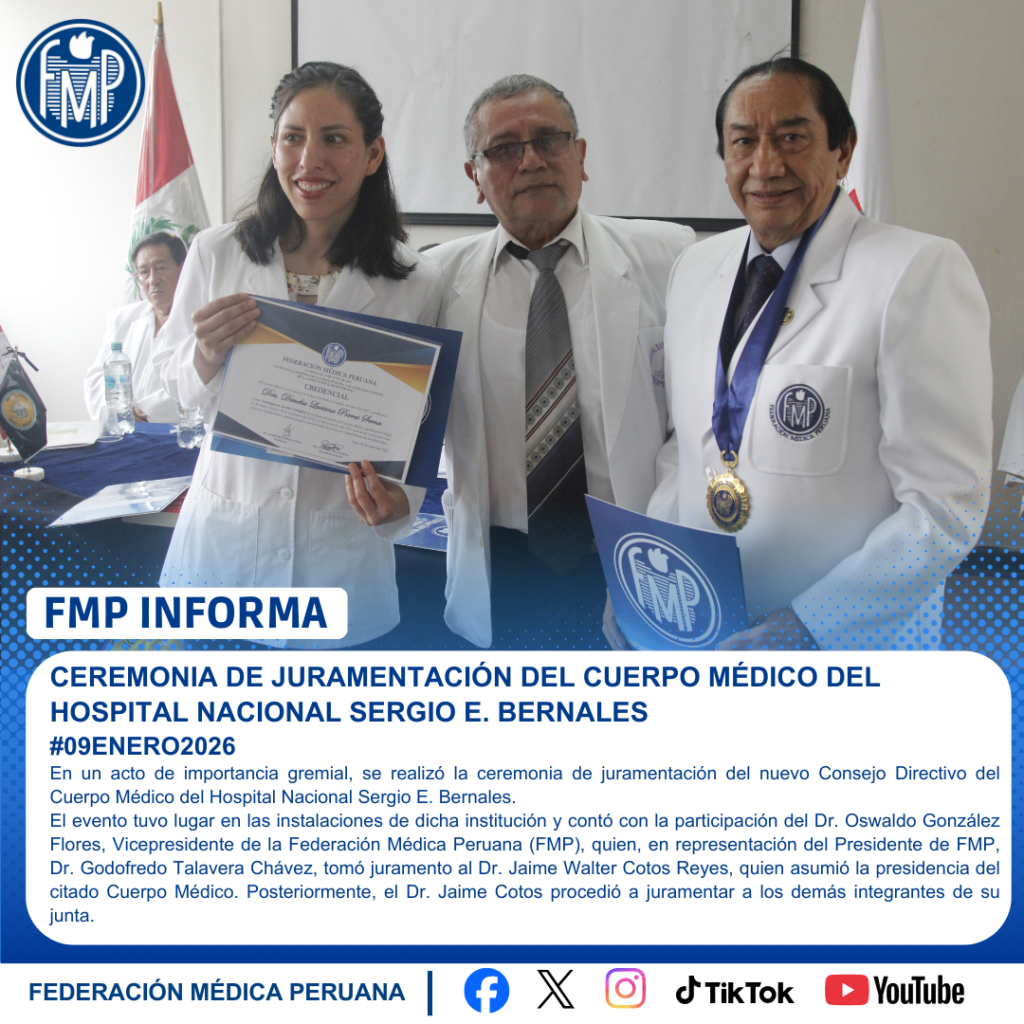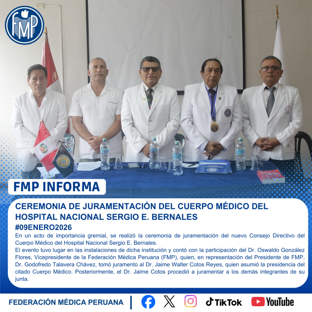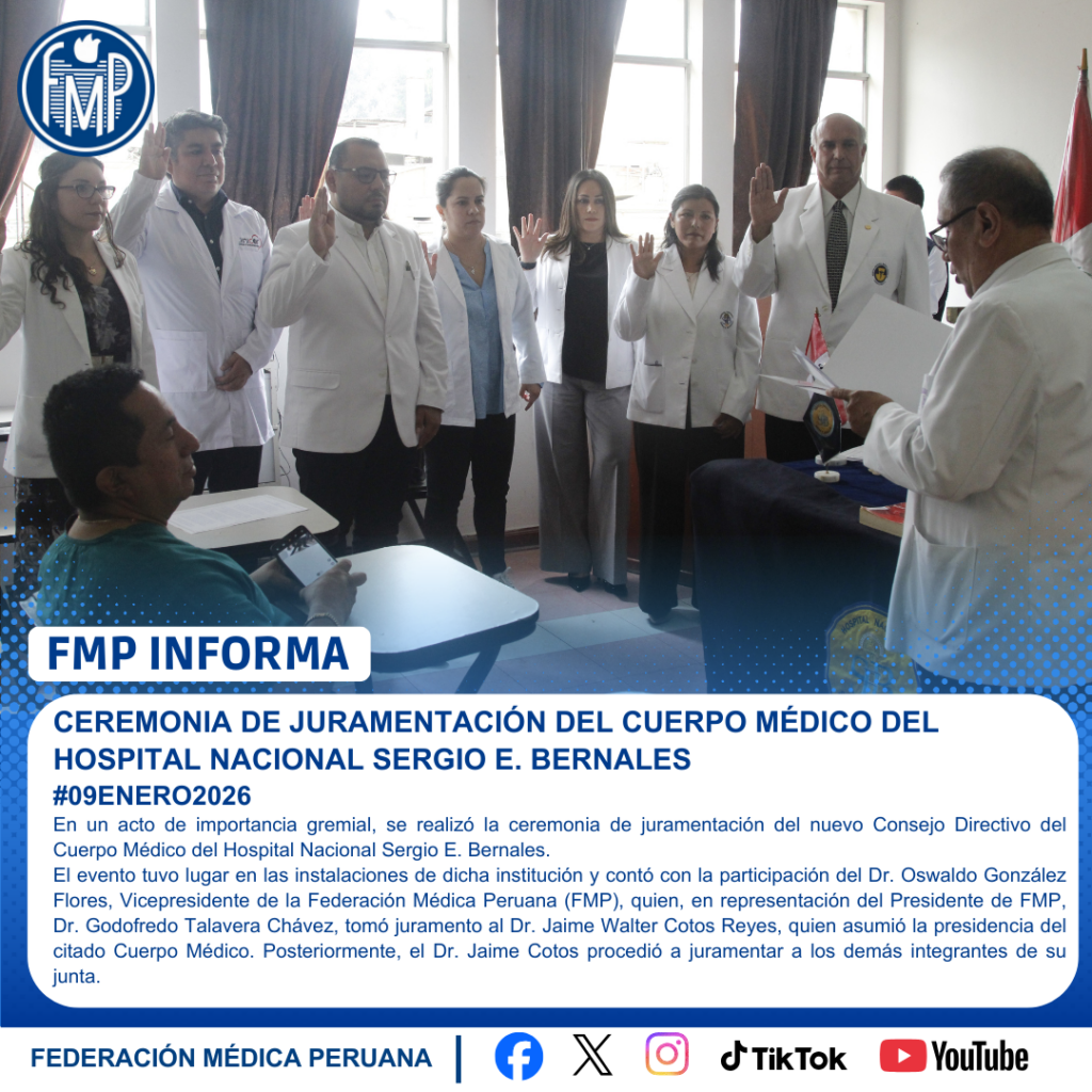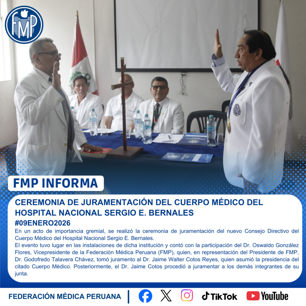 El evento tuvo lugar en las instalaciones de dicha institución y contó con la participación del Dr. Oswaldo González Flores, Vicepresidente de la Federación Médica Peruana (FMP), quien, en representación del Presidente de FMP, Dr. Godofredo Talavera Chávez, tomó juramento al Dr. Jaime Walter Cotos Reyes, quien asumió la presidencia del citado Cuerpo Médico. Posteriormente, el Dr. Jaime Cotos procedió a juramentar a los demás integrantes de su junta.