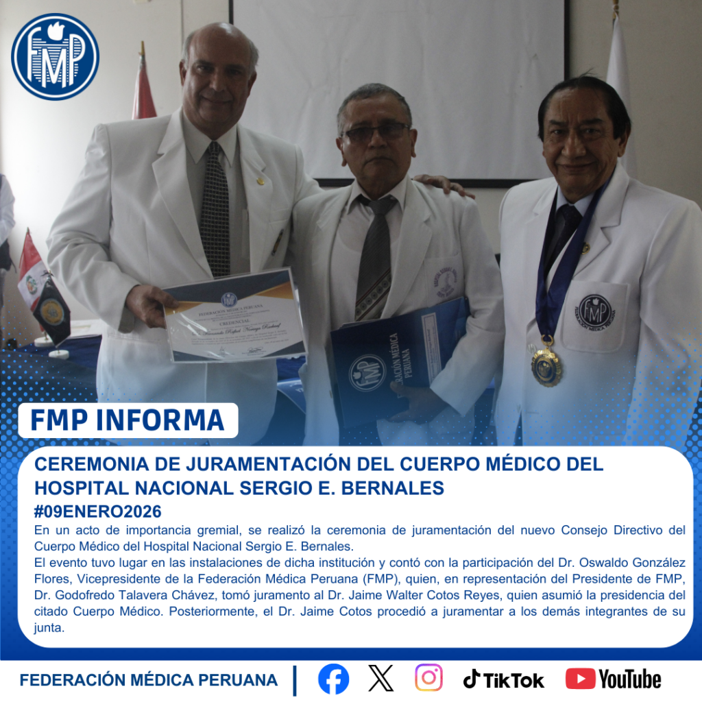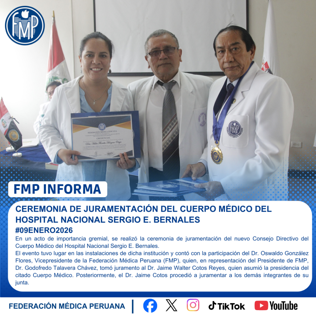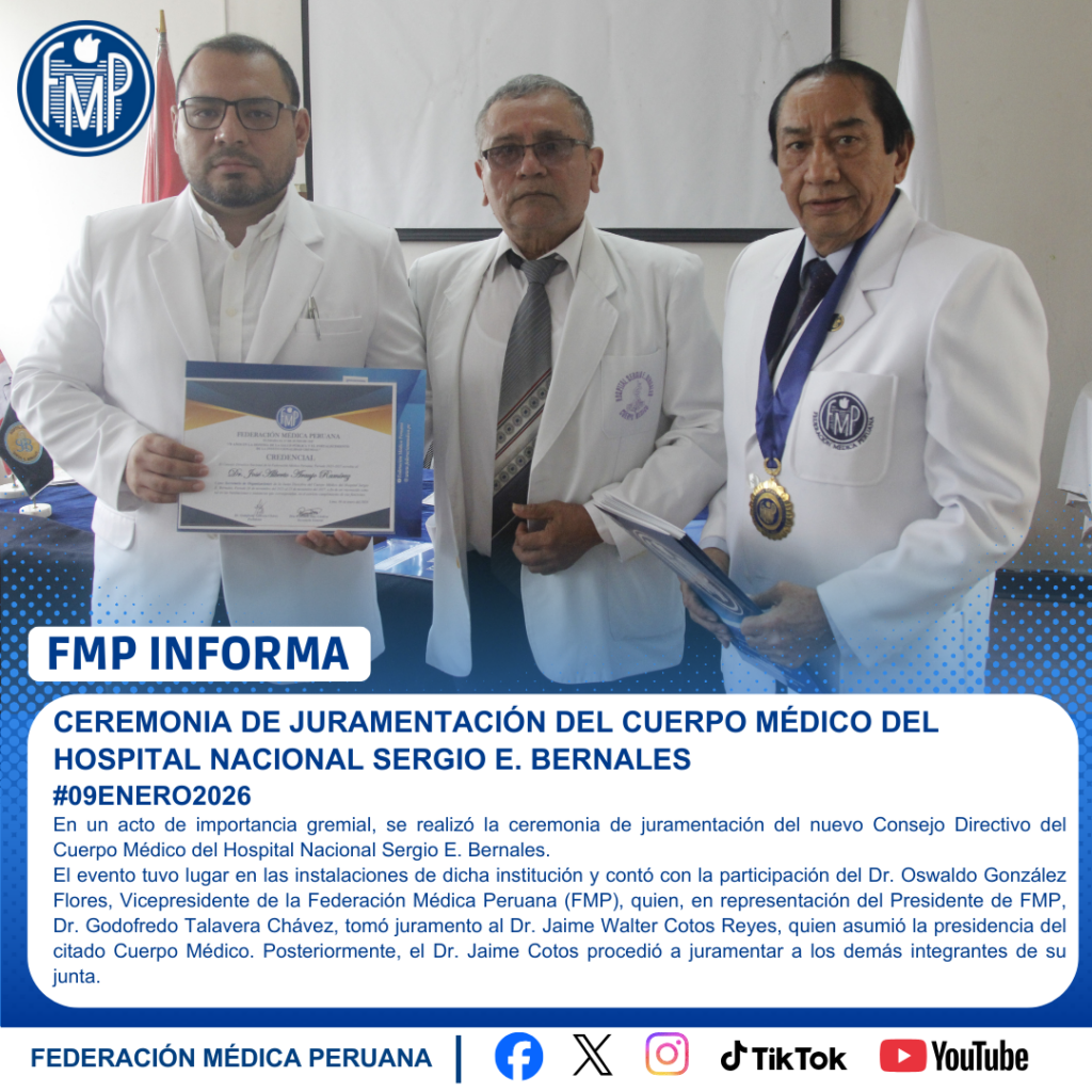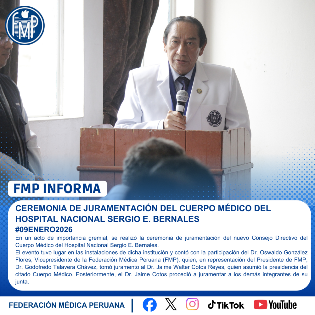 El evento tuvo lugar en las instalaciones de dicha institución y contó con la participación del Dr. Oswaldo González Flores, Vicepresidente de la Federación Médica Peruana (FMP), quien, en representación del Presidente de FMP, Dr. Godofredo Talavera Chávez, tomó juramento al Dr. Jaime Walter Cotos Reyes, quien asumió la presidencia del citado Cuerpo Médico. Posteriormente, el Dr. Jaime Cotos procedió a juramentar a los demás integrantes de su junta.