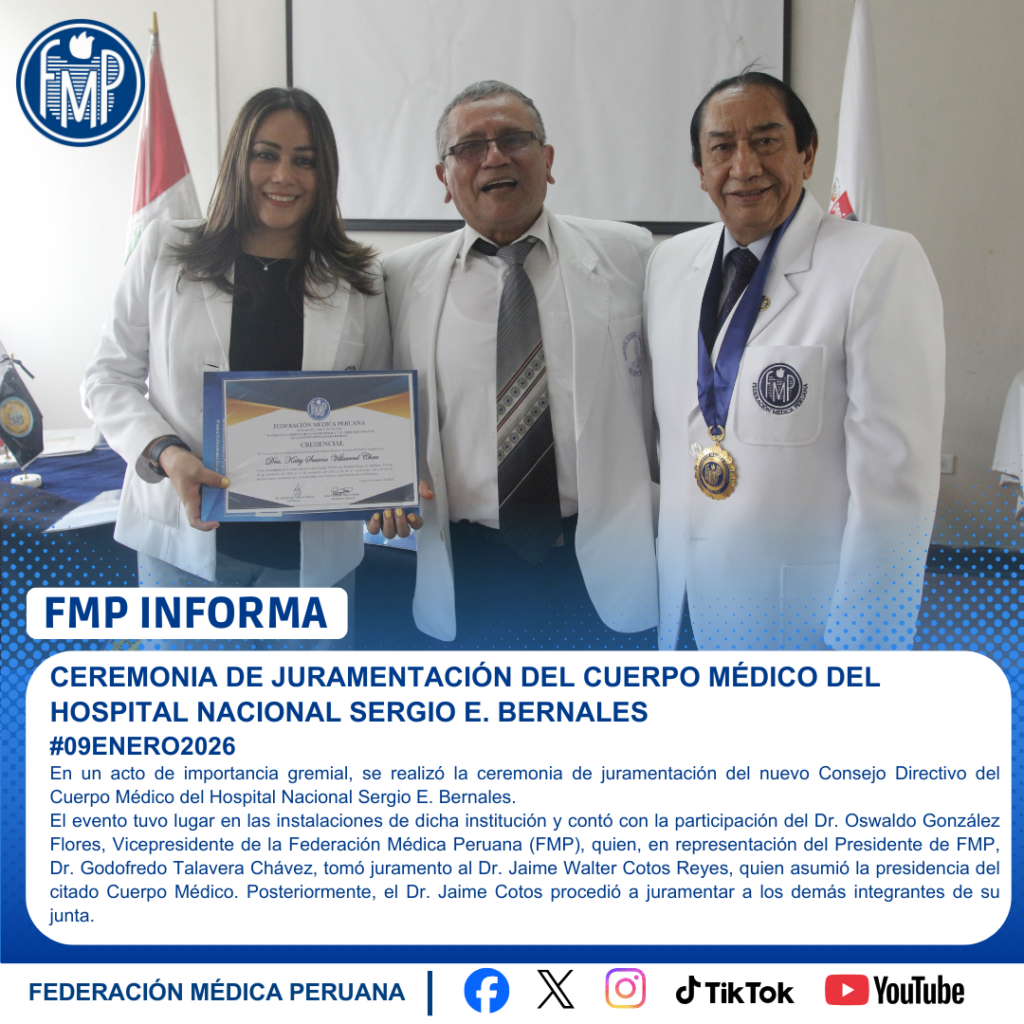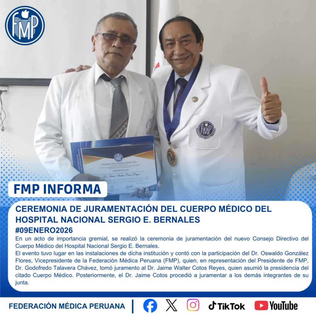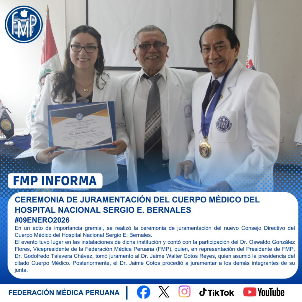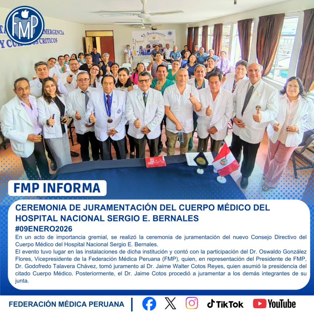 El evento tuvo lugar en las instalaciones de dicha institución y contó con la participación del Dr. Oswaldo González Flores, Vicepresidente de la Federación Médica Peruana (FMP), quien, en representación del Presidente de FMP, Dr. Godofredo Talavera Chávez, tomó juramento al Dr. Jaime Walter Cotos Reyes, quien asumió la presidencia del citado Cuerpo Médico. Posteriormente, el Dr. Jaime Cotos procedió a juramentar a los demás integrantes de su junta.