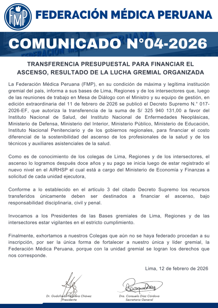 ✅ ¡SE LOGRÓ ! 👨🏻⚕️🗣️ TRANSFERENCIA PRESUPUESTAL PARA FINANCIAR EL ASCENSO, RESULTADO DE LA LUCHA GREMIAL ORGANIZADApor Federacion Medica Peruana12/02/202612/02/2026Descargar: Decreto Supremo N.° 017-2026-EF ASCENSO