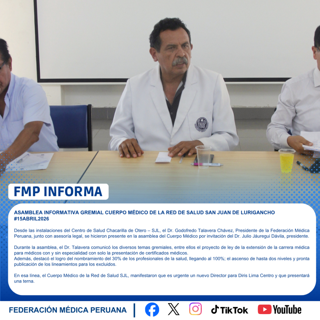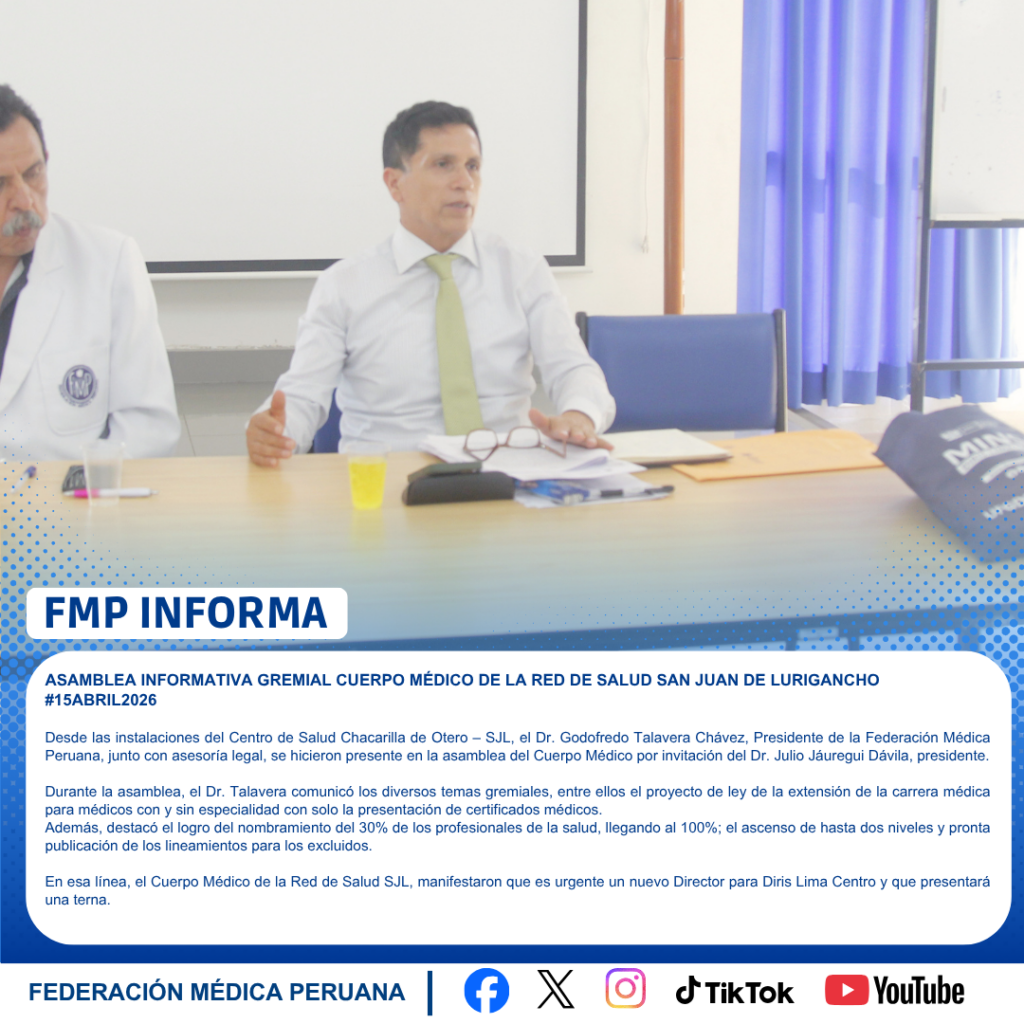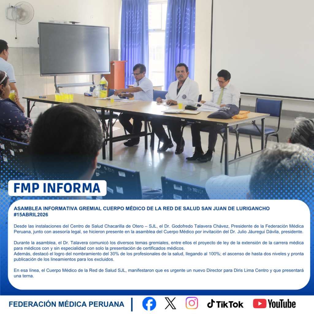 Desde las instalaciones del Centro de Salud Chacarilla de Otero โ SJL, el Dr. Godofredo Talavera Chรกvez, Presidente de la Federaciรณn Mรฉdica Peruana, junto con asesorรญa legal, se hicieron presente en la asamblea del Cuerpo Mรฉdico por invitaciรณn del Dr. Julio Jรกuregui Dรกvila, presidente.
