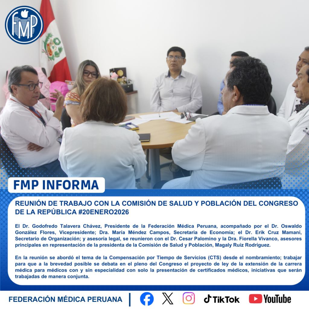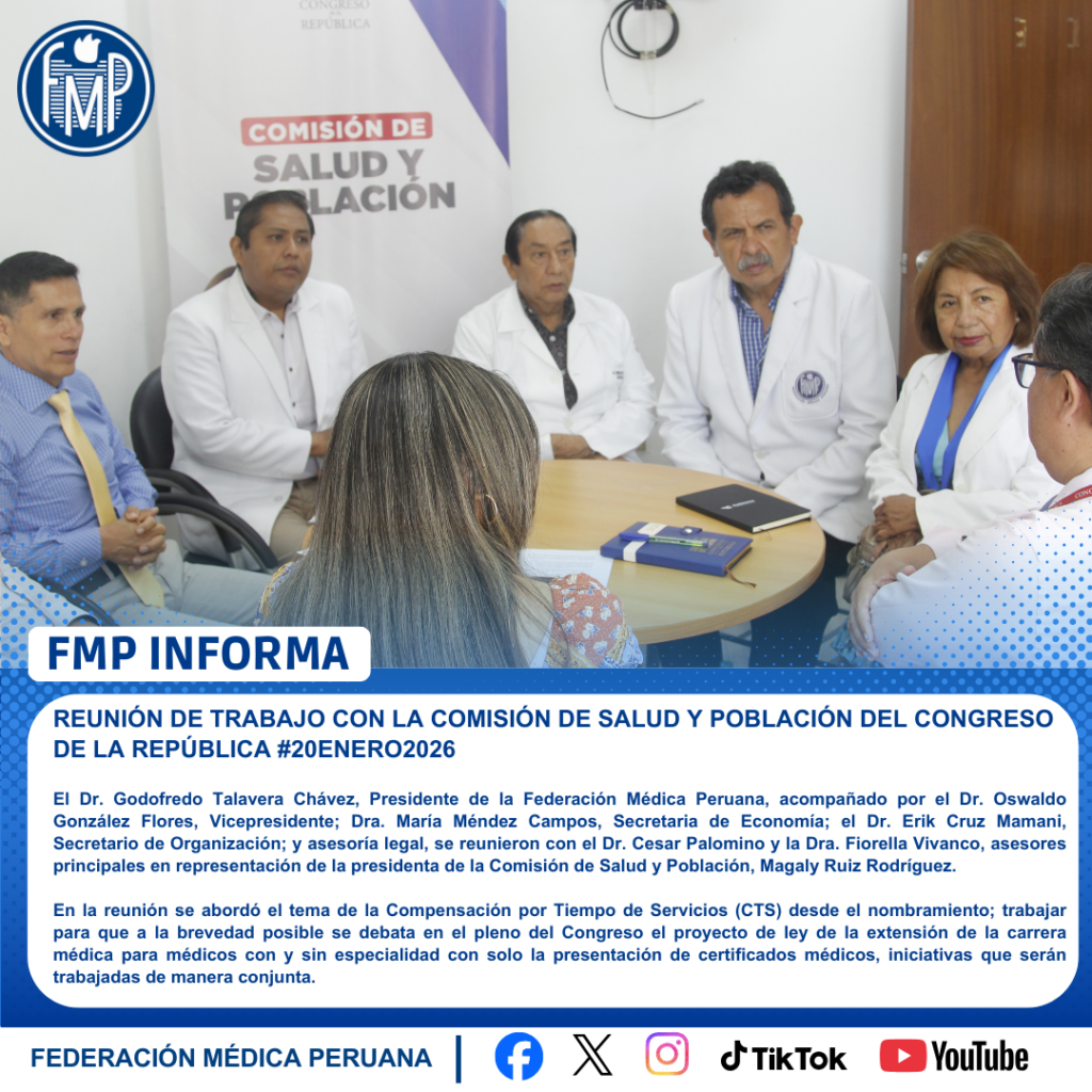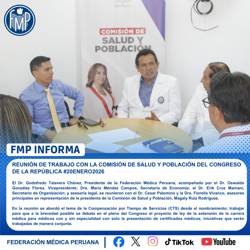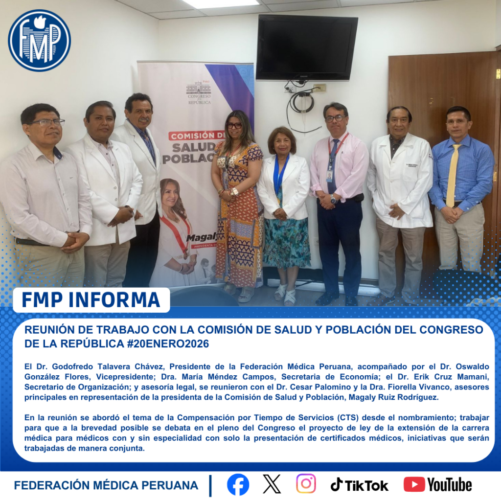 El Dr. Godofredo Talavera Chávez, Presidente de la Federación Médica Peruana, acompañado por el Dr. Oswaldo González Flores, Vicepresidente; Dra. María Méndez Campos, Secretaria de Economía; el Dr. Erik Cruz Mamani, Secretario de Organización; y asesoría legal, se reunieron con el Dr. Cesar Palomino y la Dra. Fiorella Vivanco, asesores principales en representación de la presidenta de la Comisión de Salud y Población, Magaly Ruiz Rodríguez.
