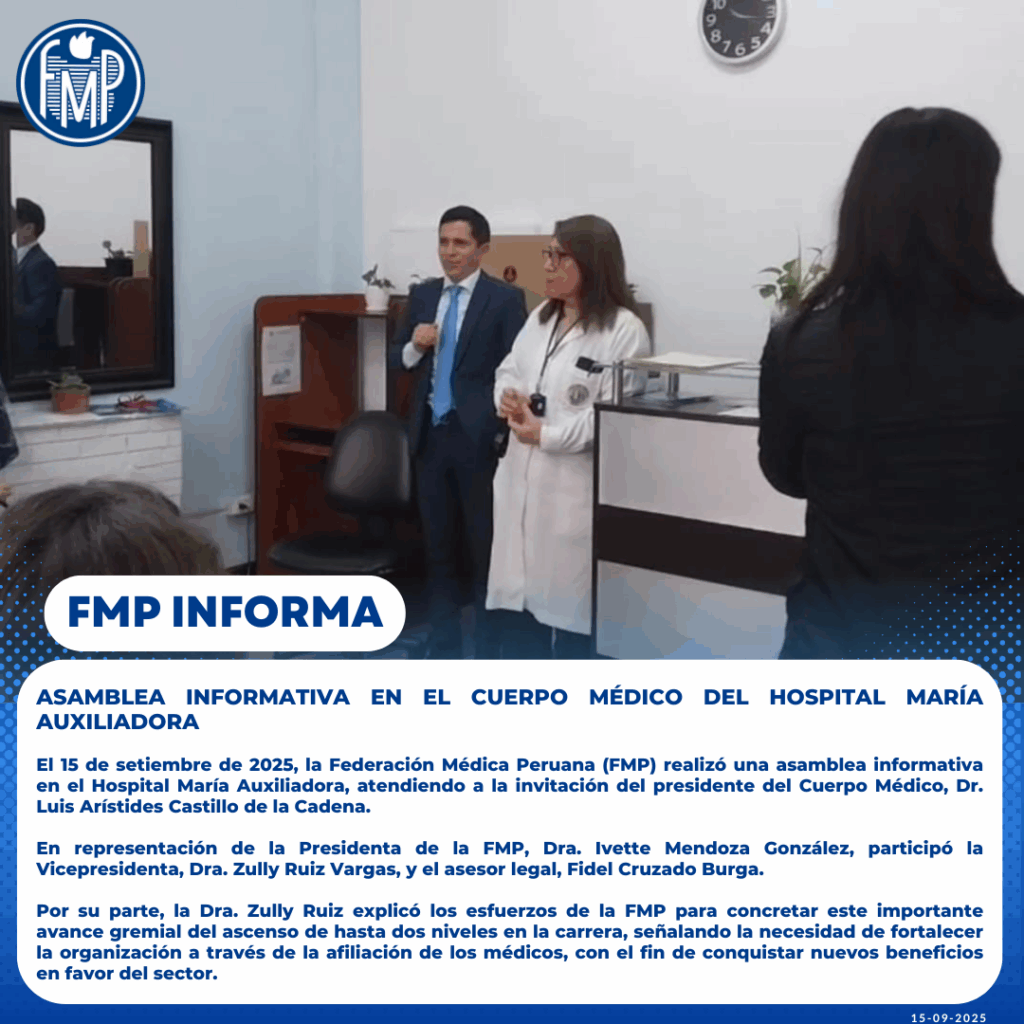 Por su parte, la Dra. Zully Ruiz explicó los esfuerzos de la FMP para concretar este importante avance gremial del ascenso de hasta dos niveles en la carrera, señalando la necesidad de fortalecer la organización a través de la afiliación de los médicos, con el fin de conquistar nuevos beneficios en favor del sector.
