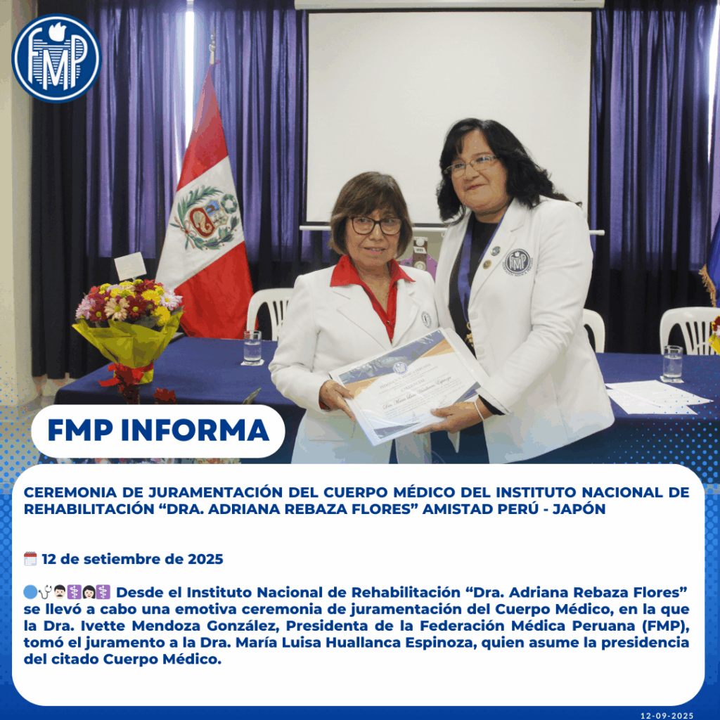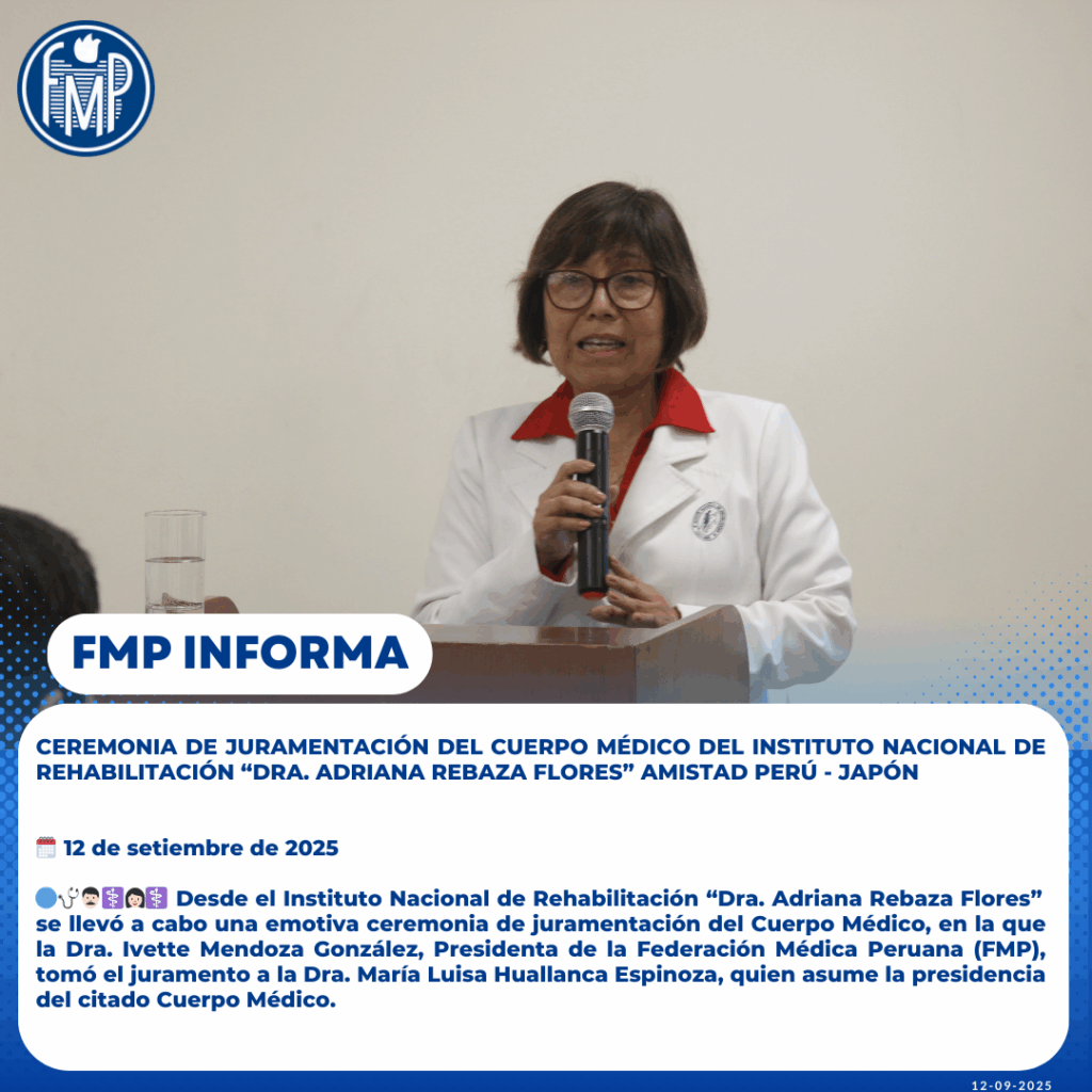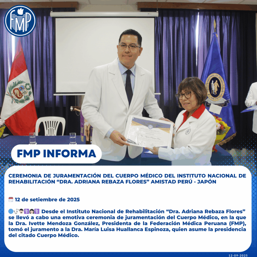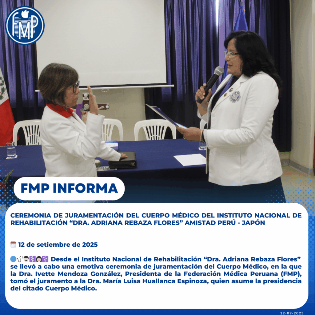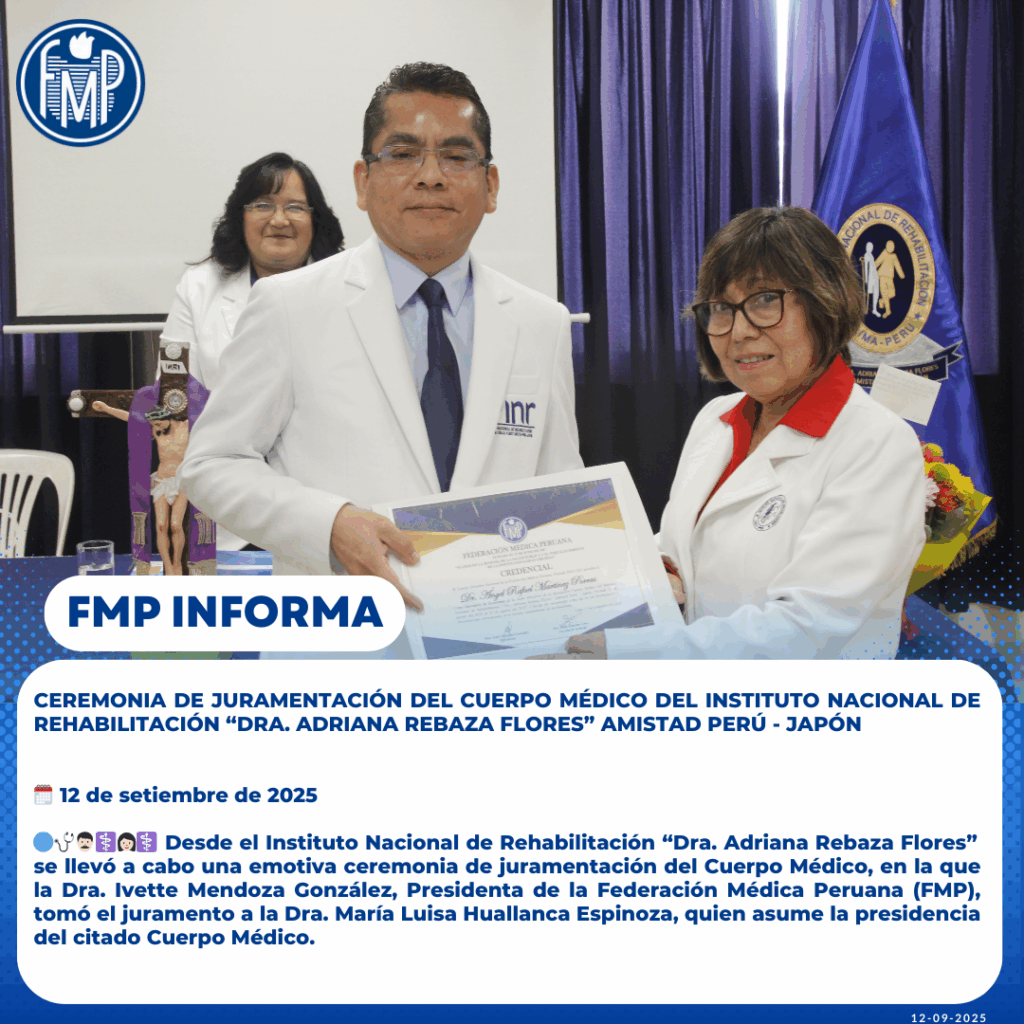 🔵👩🏻‍⚕️👨🏻‍⚕️🗣️ Desde el Instituto Nacional de Rehabilitación “Dra. Adriana Rebaza Flores” se llevó a cabo una emotiva ceremonia de juramentación del Cuerpo Médico, en la que la Dra. Ivette Mendoza González, Presidenta de la Federación Médica Peruana (FMP), tomó el juramento a la Dra. María Luisa Huallanca Espinoza, quien asume la presidencia del citado Cuerpo Médico.