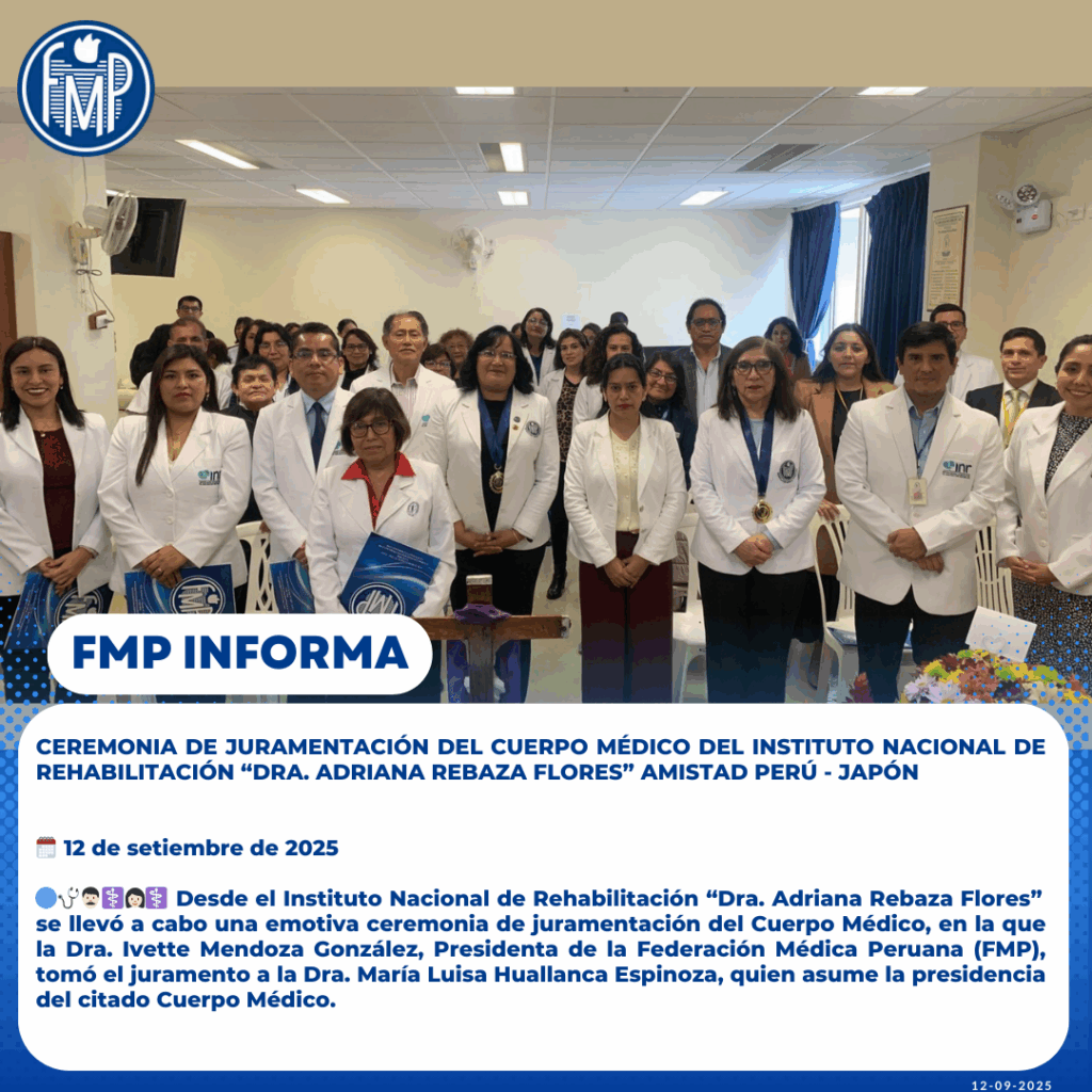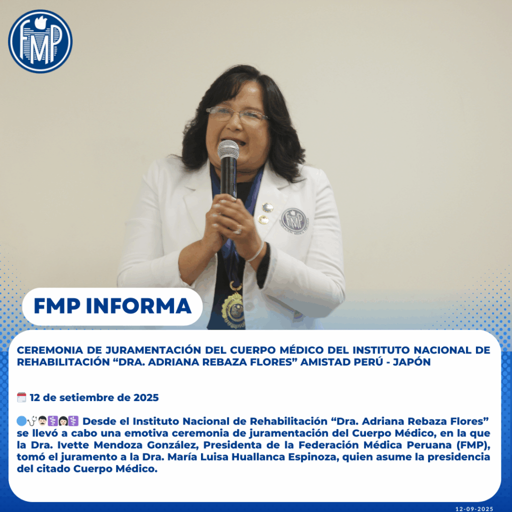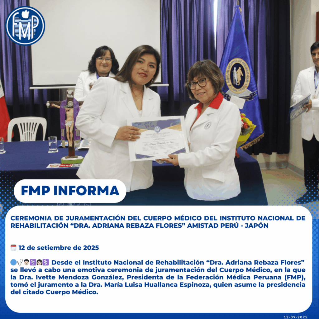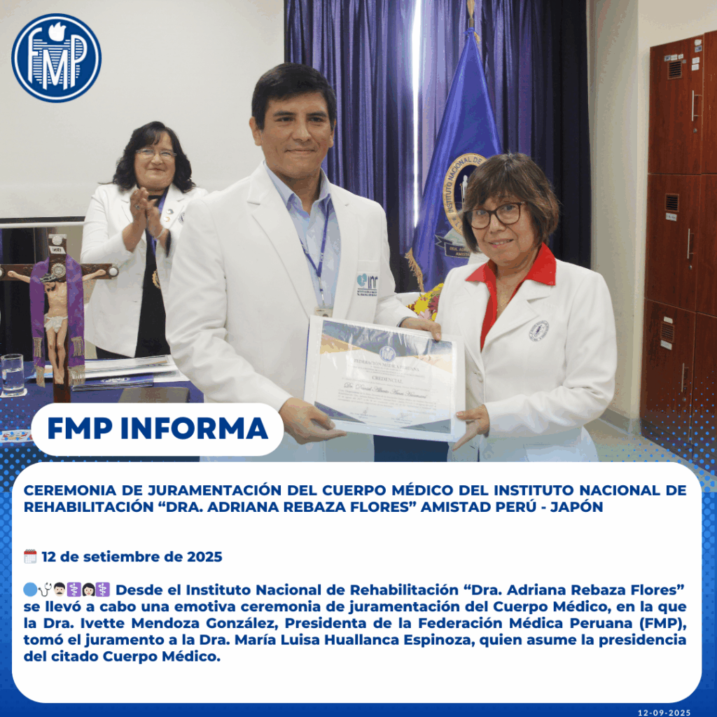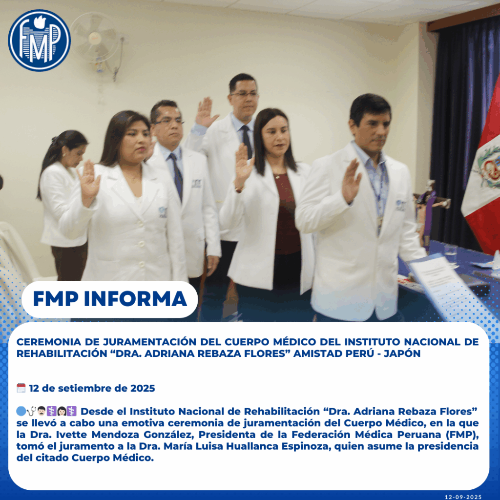 🔵👩🏻‍⚕️👨🏻‍⚕️🗣️ Desde el Instituto Nacional de Rehabilitación “Dra. Adriana Rebaza Flores” se llevó a cabo una emotiva ceremonia de juramentación del Cuerpo Médico, en la que la Dra. Ivette Mendoza González, Presidenta de la Federación Médica Peruana (FMP), tomó el juramento a la Dra. María Luisa Huallanca Espinoza, quien asume la presidencia del citado Cuerpo Médico.