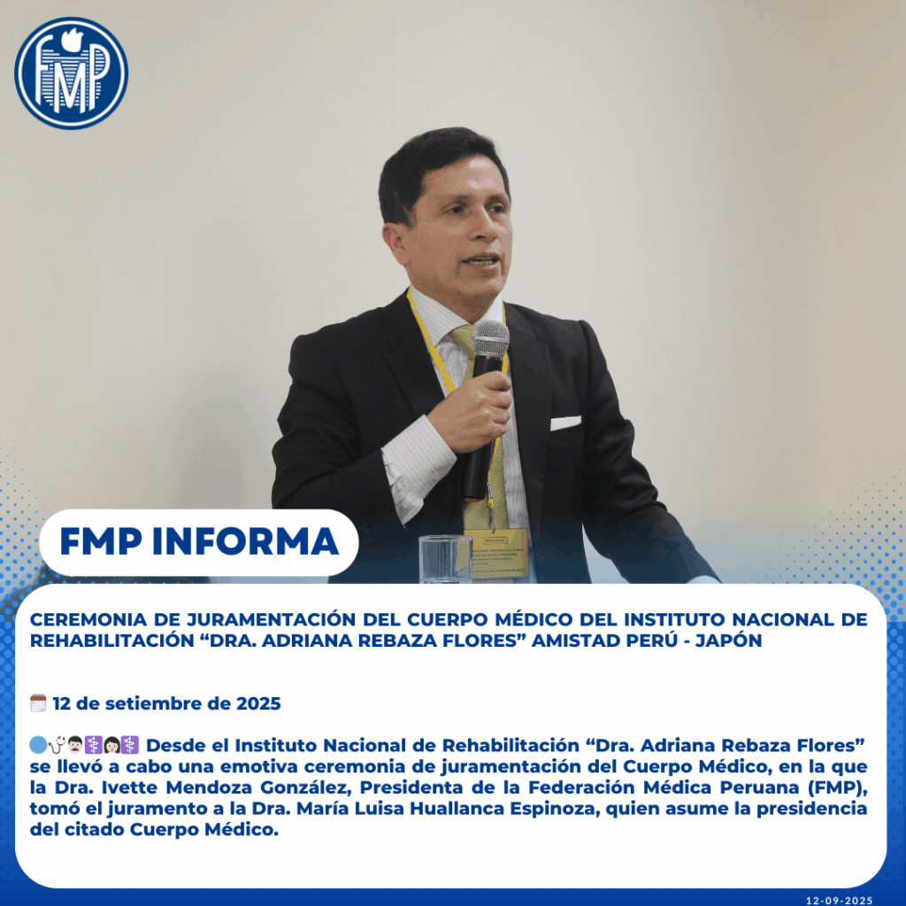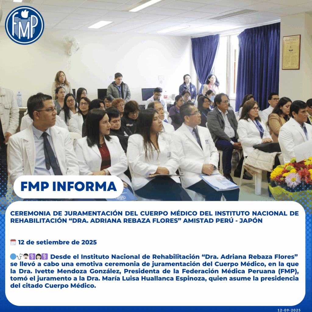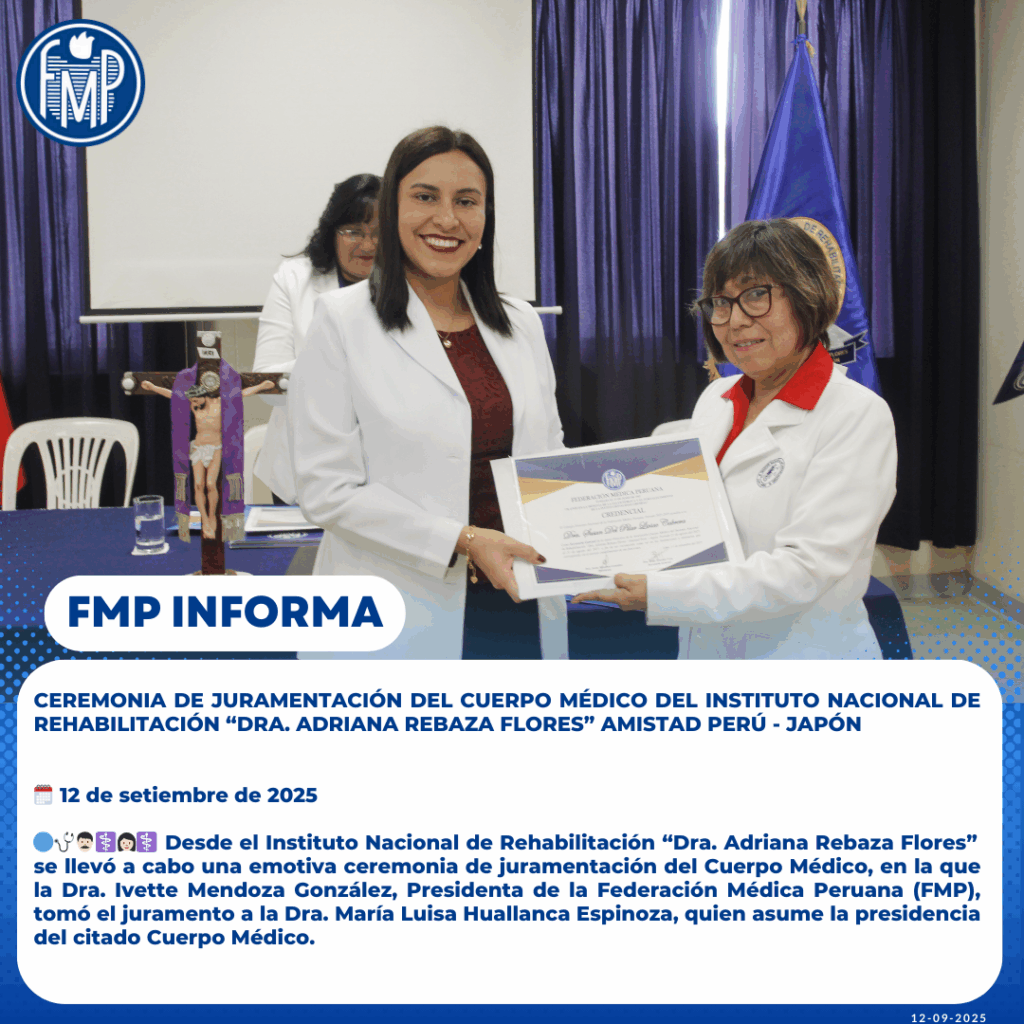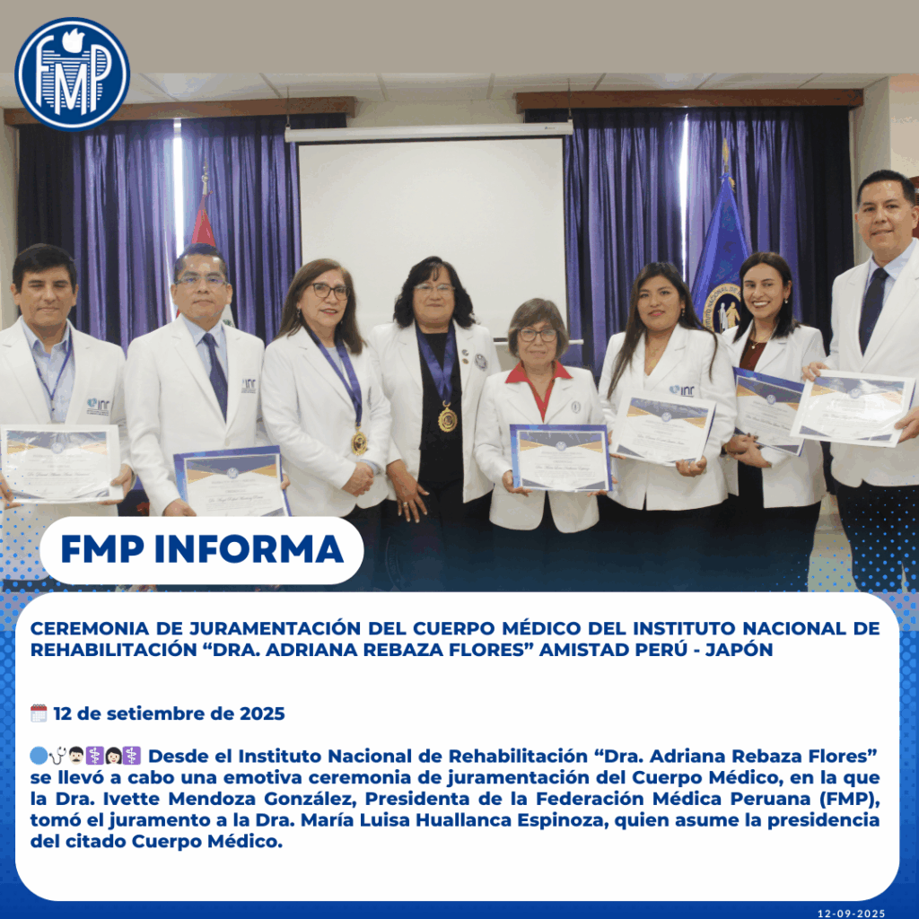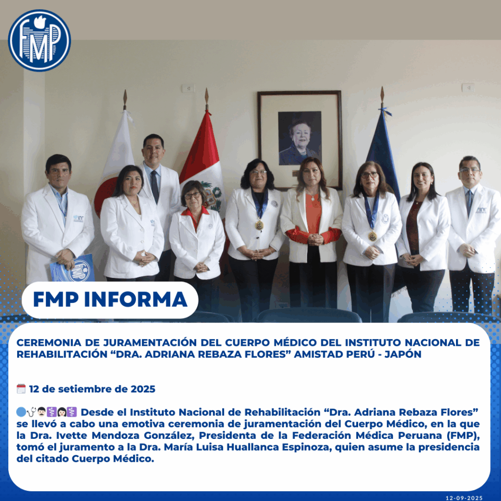 🔵👩🏻‍⚕️👨🏻‍⚕️🗣️ Desde el Instituto Nacional de Rehabilitación “Dra. Adriana Rebaza Flores” se llevó a cabo una emotiva ceremonia de juramentación del Cuerpo Médico, en la que la Dra. Ivette Mendoza González, Presidenta de la Federación Médica Peruana (FMP), tomó el juramento a la Dra. María Luisa Huallanca Espinoza, quien asume la presidencia del citado Cuerpo Médico.