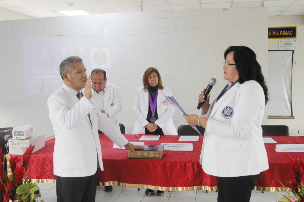 🔵👩🏻‍⚕️👨🏻‍⚕️🗣️ En una significativa ceremonia realizada en el auditorio del Centro Materno Infantil Rimac, la Dra. Ivette Mendoza González, Presidenta de la Federación Médica Peruana (FMP), tomó juramento al Dr. Gilbert Ramos Palomino como nuevo presidente del Cuerpo Médico de la Red Rímac – San Martín de Porres – Los Olivos. Seguidamente, el Dr. Ramos procedió a juramentar a los integrantes de su Junta Directiva.