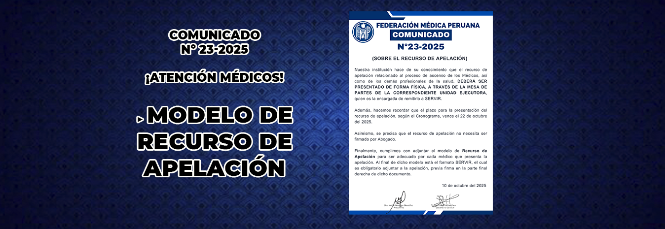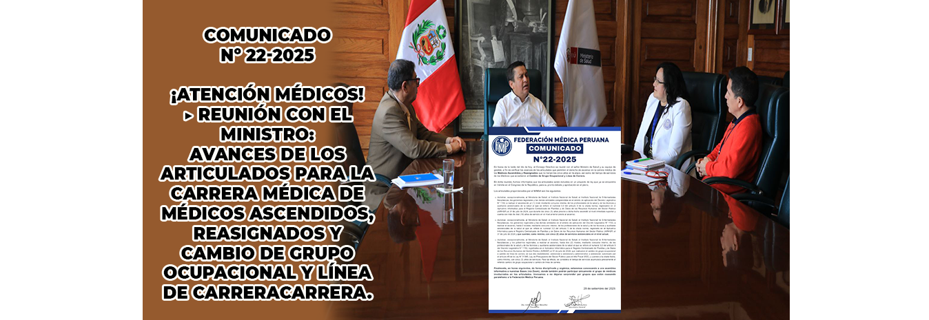 El 15 de setiembre de 2025, la Federación Médica Peruana (FMP) desarrolló una asamblea informativa en el Hospital Nacional Dos… El 15 de setiembre de 2025, la Federación Médica Peruana (FMP) realizó una asamblea informativa en el Hospital María Auxiliadora,… El 13 de setiembre de 2025, la Federación Médica Peruana (FMP) llevó a cabo una asamblea informativa en la DIRESA… 12 de setiembre de 2025 En el auditorio “Alberto Andrade Carmona” del Congreso de la República se realizó la ceremonia… 12 de setiembre de 2025 Desde el Instituto Nacional de Rehabilitación “Dra. Adriana Rebaza Flores” se llevó a cabo una…Asamblea Informativa en el Cuerpo Médico del Hospital Nacional Dos de Mayo